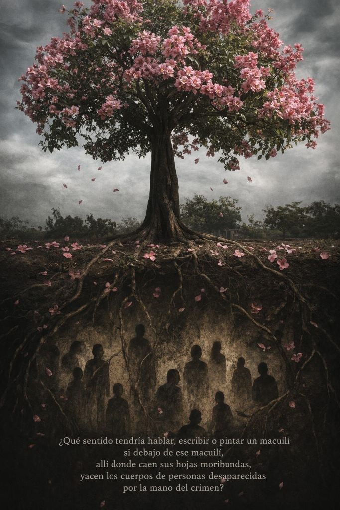 Entonces ¿Qué es el arte? No lo sé, pero lo que sí sé es que si tuviera algún propósito es el de abrir los ojos y de despertar el mundo. No se trata de reproducir las nubes, la mazorca y el árbol de macuilí, sino de interrogar a través de estos y otros artefactos una realidad para la cual ya no hay un lenguaje que fácilmente la enuncie. Es decir ¿Qué sentido tendría hablar, escribir o pintar un macuilí si debajo de ese macuilí, allí donde caen sus hojas moribundas, yacen los cuerpos de personas desaparecidas por la mano del crimen?
